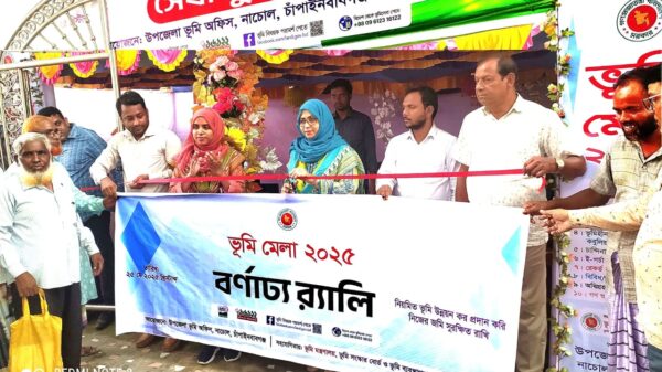 ভূমি মেলায় উপজেলা ভূমি অফিস, ইউনিয়ন ভূমি অফিসের কর্মকর্তা-কর্মচারি ও সেবা গ্রহিতাদের অংশগ্রহণে একটি বর্ণাঢ্য র্যালি বের হয়ে রেলস্টেশন-নাচোল বাসস্ট্যান্ড রোড প্রদক্ষিণ শেষে উপজেলা ভূমি অফিস চত্বরে সেবা বুথের সামনে, মেলার শুভ উদ্বোধন করেন উপজেলা নির্বাহী অফিসার নীলুফা সরকার।