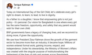 বিএনপির ভারপ্রাপ্ত চেয়ারম্যান তারেক রহমান বলেছেন, প্রতিটি কন্যাশিশুর স্বপ্ন পূরণের পথে রাষ্ট্রকে তার অংশীদার বানাতে চান তারা। বাংলাদেশের জন্য তাদের দৃষ্টিভঙ্গি এমন এক দেশ গড়া, যেখানে প্রতিটি মেয়ের থাকবে সমান স্বাধীনতা, সুযোগ ও সুরক্ষা—যা প্রতিটি পিতা-মাতা তাদের সন্তানের জন্য কামনা করেন।