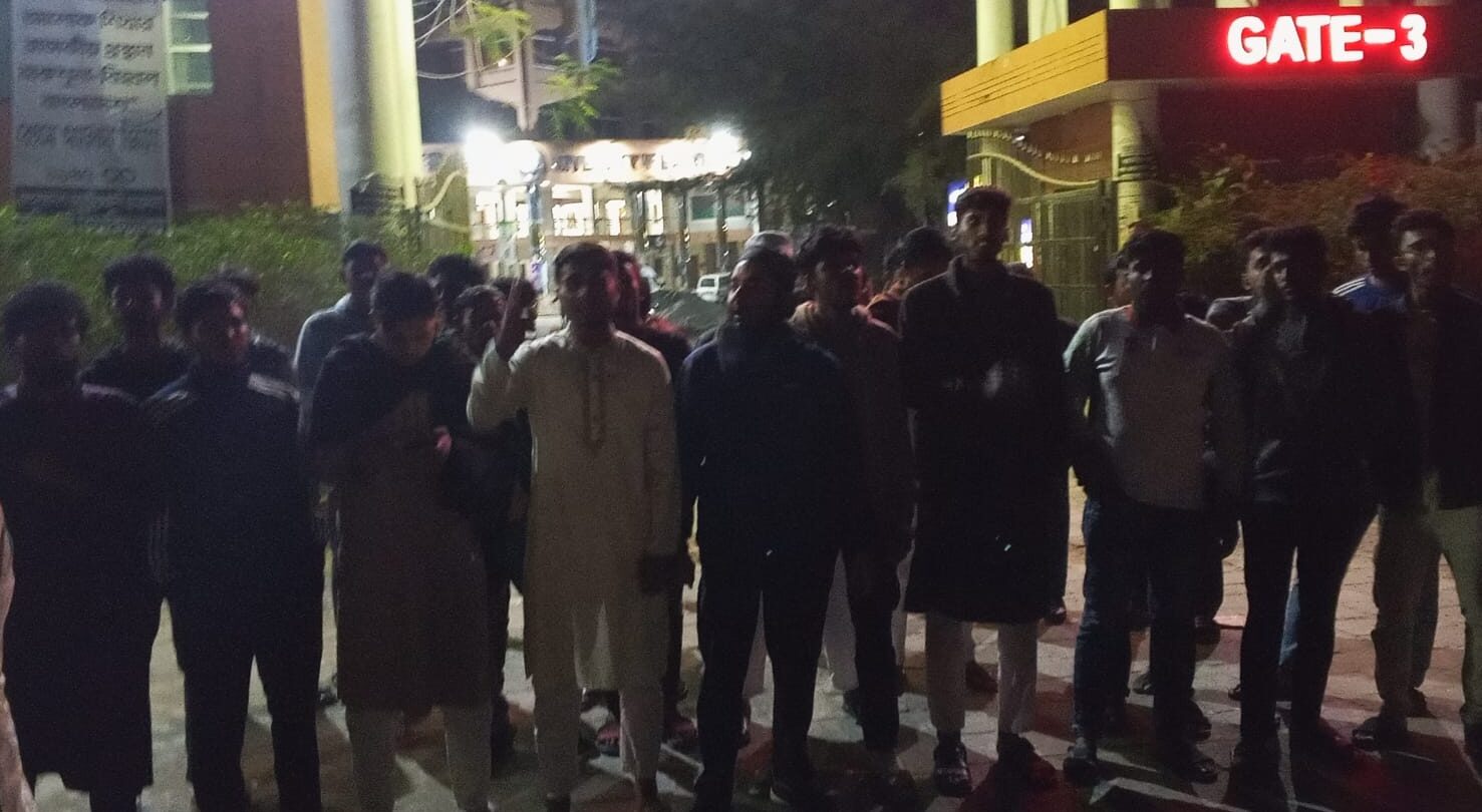 ‎এ সময় আন্দোলনরত শিক্ষার্থীরা বিভিন্ন স্লোগানে ক্যাম্পাস মুখরিত করে তোলেন। তাদের কণ্ঠে শোনা যায়— “আমার ভাই আহত কেন, অন্তর্বর্তী সরকার জবাব চাই”, “দিল্লি না ঢাকা? ঢাকা ঢাকা”, “গুলির মুখে কথা কবো, আমরা সবাই হাদি হবো”।