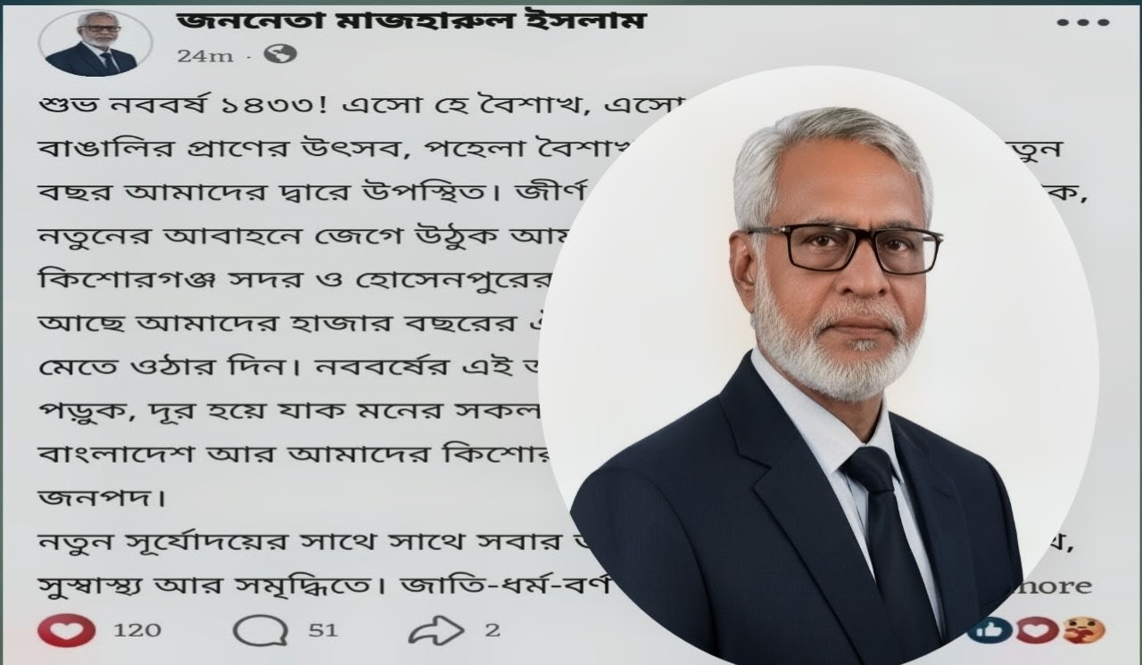 বাঙালির প্রাণের উৎসব পহেলা বৈশাখ ও বাংলা নববর্ষ ১৪৩৩ উপলক্ষে কিশোরগঞ্জ সদর ও হোসেনপুর আসনের সর্বস্তরের জনগণকে আন্তরিক শুভেচ্ছা ও অভিনন্দন জানিয়েছেন স্থানীয় সংসদ সদস্য জননেতা মাজাহারুল ইসলাম। আজ সোমবার সকালে তাঁর ভেরিফাইড ফেসবুক পেজে দেওয়া এক বার্তায় তিনি এই শুভেচ্ছা জানান।